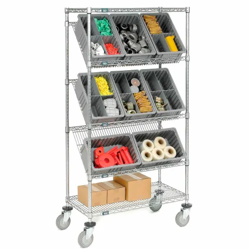 Global Industrial™ Easy Access Slant Shelf Wire Cart 12 3-1/2"H Grid Containers Gray 36x18x63