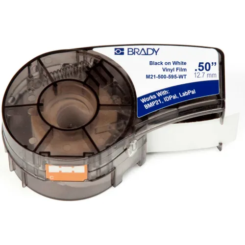 Étiquettes de vinyle industriels intérieurs-extérieurs Brady BMP21, 1-2"W X 21'L, Blk-White, M21-500-595-WT