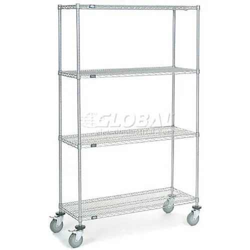Chariot à 4 étagères Nexel®, chrome, 48 po L x 18 po P x 80 po H, roulettes à tige en polyuréthane, 4 pivotantes, 2 freins