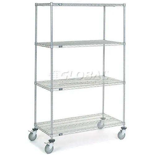 Chariot à 4 étagères Nexel®, chrome, 48 po L x 24 po P x 80 po H, roulettes à tige en polyuréthane, 4 pivotantes, 2 freins