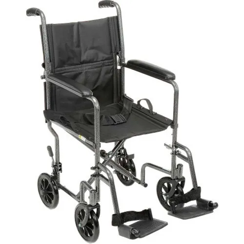 Fauteuil roulant de transport en acier léger, siège de 19 po de largeur, structure argentée et revêtement noir