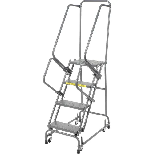 Escabeau roulant, acier, 4 marches perforées de 16 po l, marche supérieure de 14 po P, avec mains courantes, gris – FSH418P