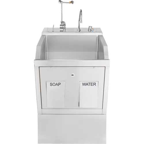 Évier de gommage Lodi à station unique Blickman avec lavage oculaire et minuterie numérique, contrôle de l’action du genou